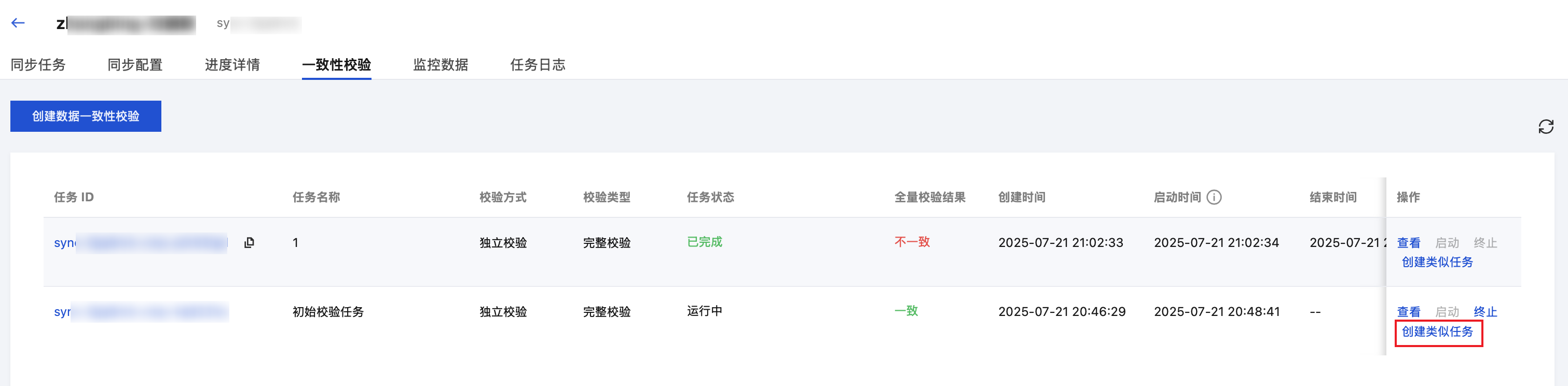 如果已存在一致性校验任务,可以单击操作列的创建类似任务,并支持配置相关参数。