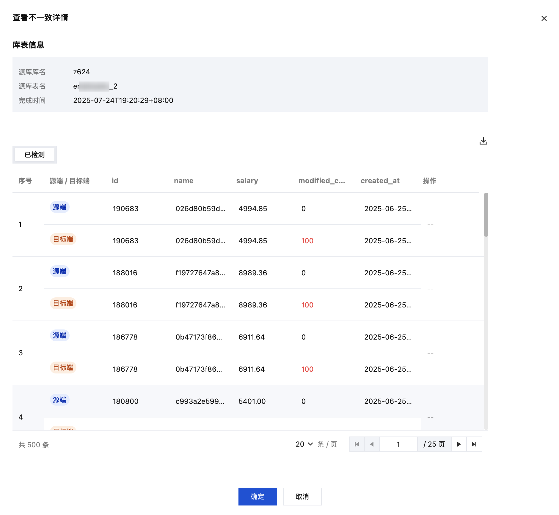 3.1.4 在已检测区域单击对应表后的查看,可查看不一致的数据详情。