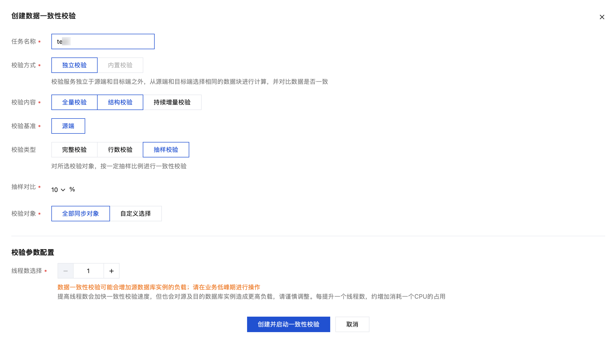 4. 在弹出的对话框中,配置数据一致性校验参数后,单击创建并启动一致性校验。