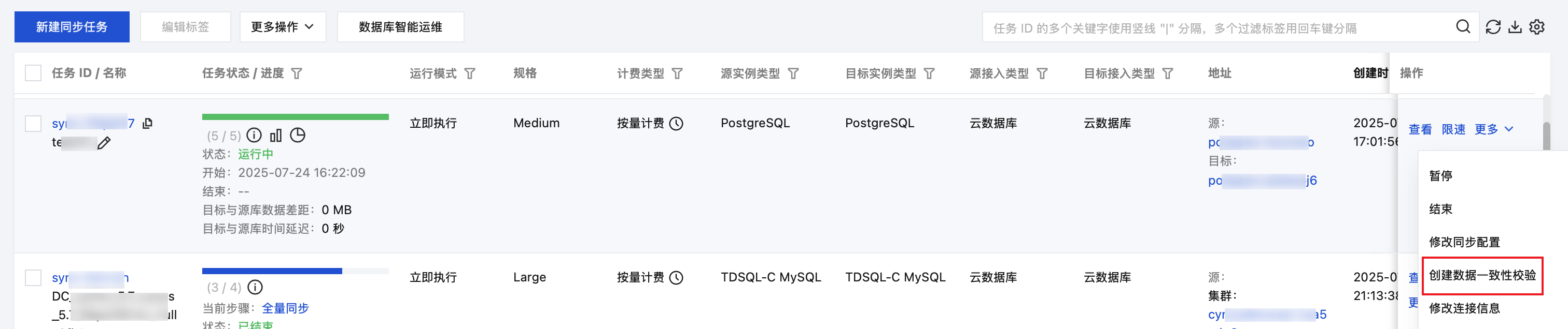 2. 在数据同步页面,选择需要校验的同步任务,在操作列单击更多 > 创建数据一致性校验。