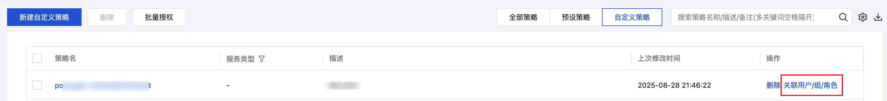 10. (可选)单击完成后返回到策略列表页,在列表页中单击关联用户/组/角色。
