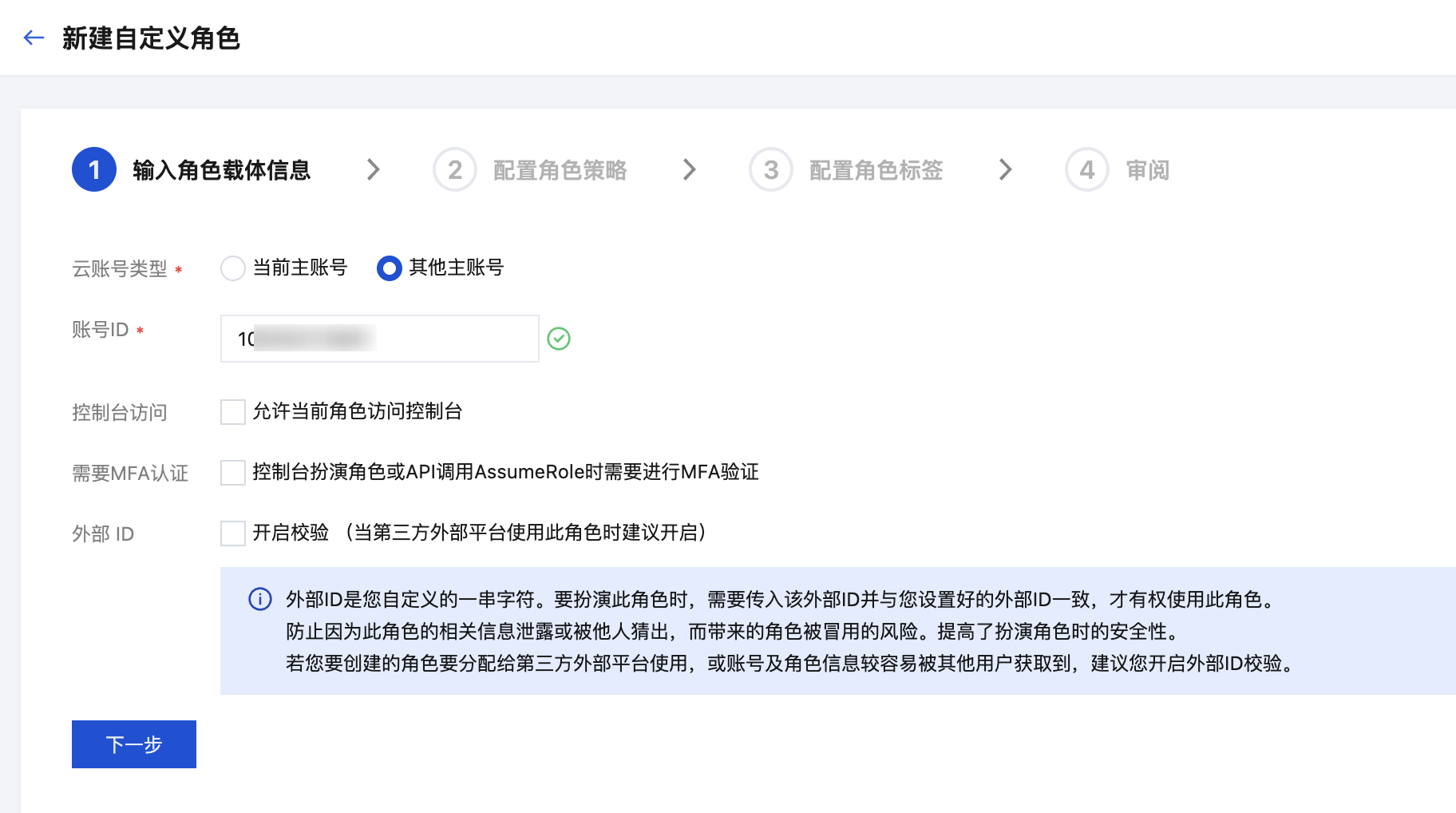 4. 在输入角色载体信息页面,配置相关信息,单击下一步。