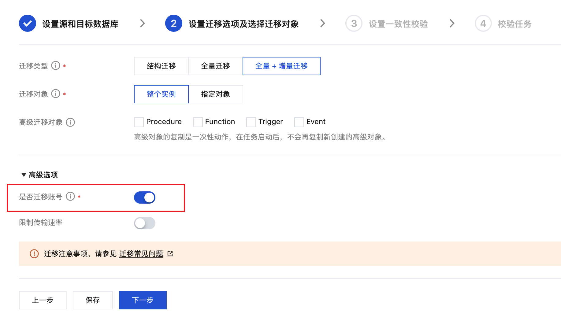 1. 在 数据迁移任务 的设置迁移选项及选择迁移对象页面,勾选是否迁移账号。