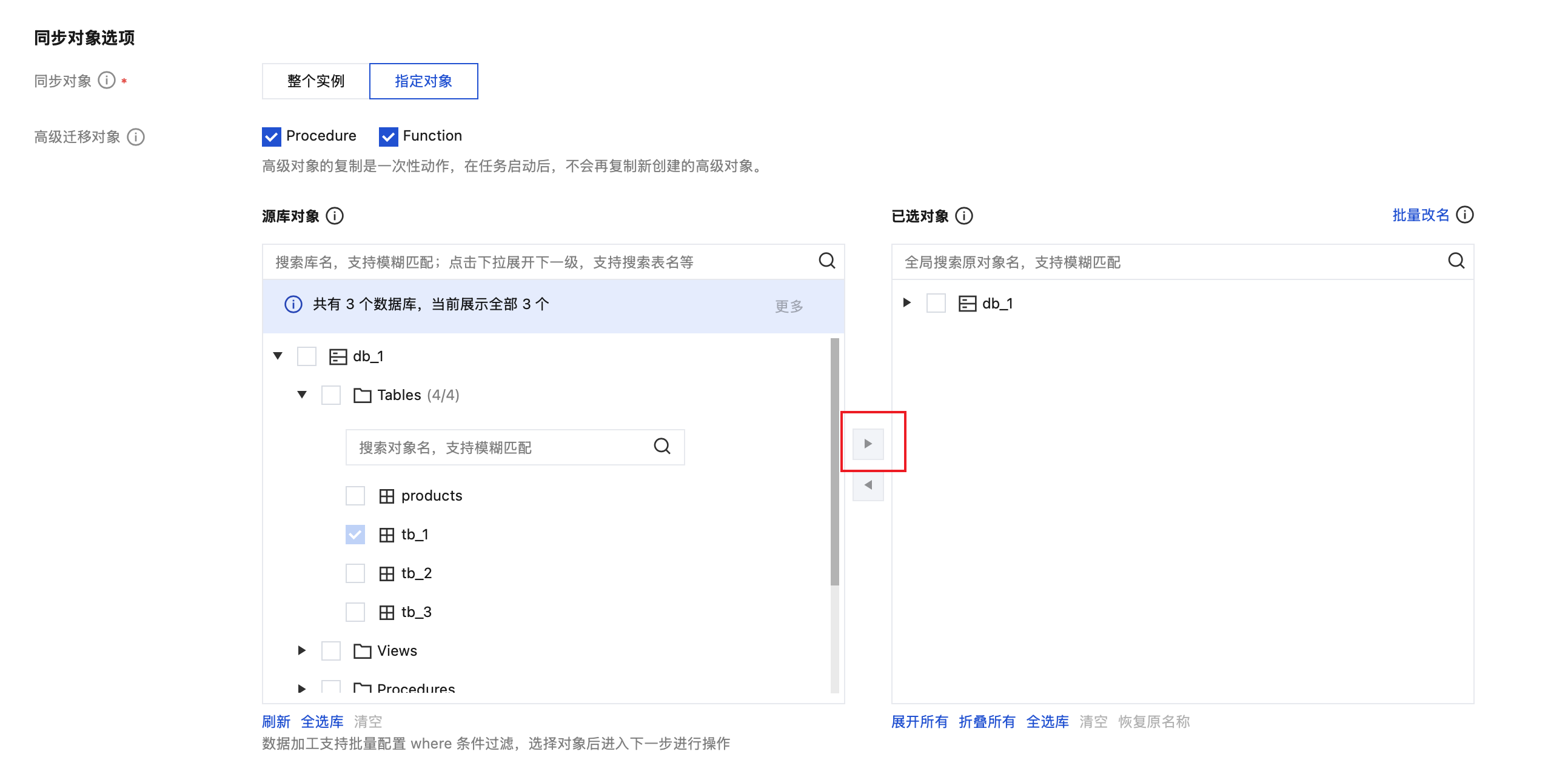 如果一个表进行了列过滤,用户同时还对该表设置 Where 规则,需要用户自行保证输入 Where 规则中的列名,包含在待同步的表中,否则 Where 规则可以设置成功,但后续任务启动后会报错。