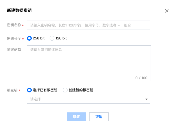 根密钥 | 必选;数据加密密钥是基于根密钥生成的二级密钥,您可以选择已有根密钥或创建新的根密钥。 |