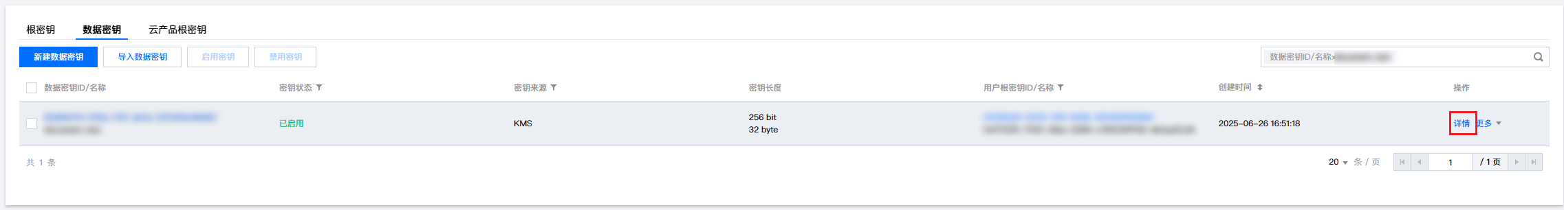 1. 在数据密钥管理页,选择您需要查看详情的密钥,单击详情,即可进入密钥详情页。