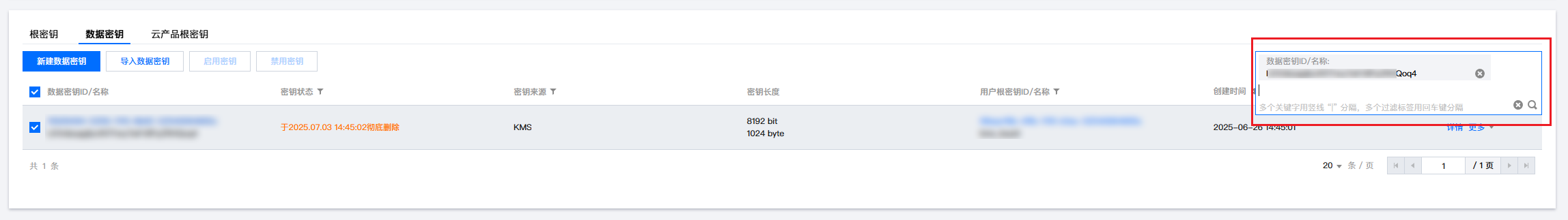 3. 在数据密钥管理页,您可以在右侧筛选框中,通过数据密钥ID/名称,筛选查找您需要的密钥。