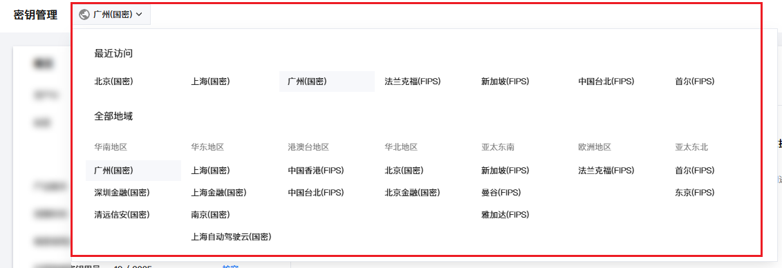 2. 切换上方区域可以查看其他区域主密钥列表。