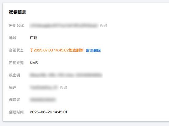 2. 在密钥详情页中,将显示该密钥的密钥名称、地域、密钥状态、密钥来源、根密钥、创建者、创建时间等信息。