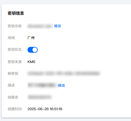 在数据密钥管理页,单击需要编辑的密钥的 ID/名称,进入该密钥的详情页,您可修改密钥的名称、状态以及描述信息等。