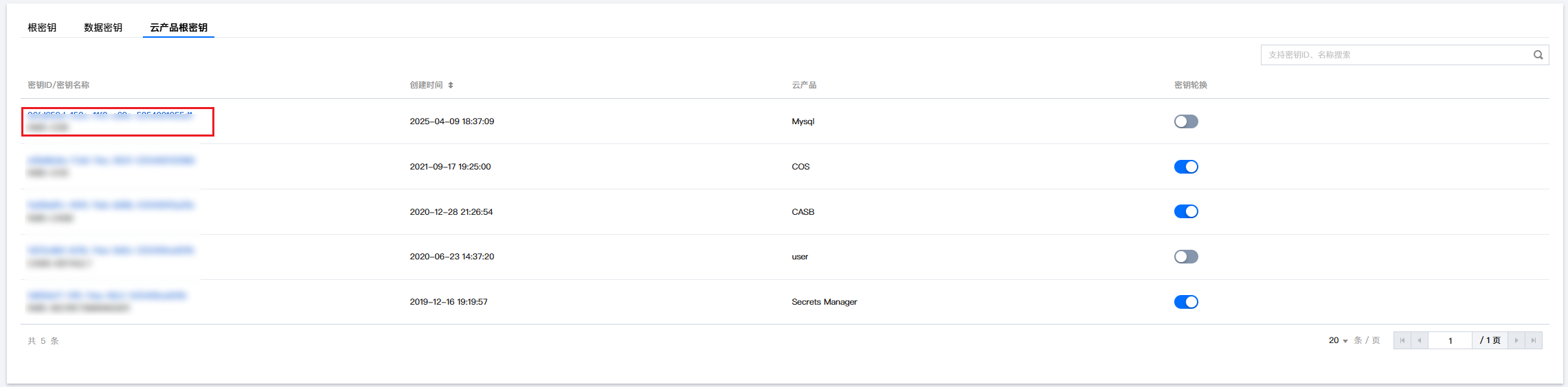 云产品密钥是腾讯云产品/服务(例如 CBS、COS、TDSQL 等)在调用密钥管理系统时,自动为用户创建的 CMK。您可以对云产品密钥进行查询及开启密钥轮换操作,不支持禁用、计划删除操作。本文为您介绍通过控制台方式查看云产品密钥详情。