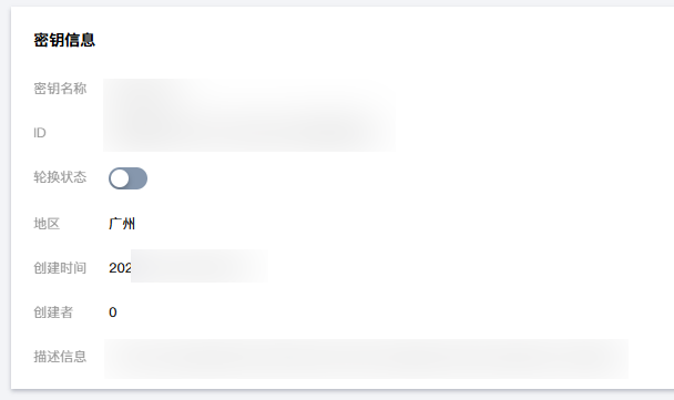 4. 在密钥详情页中,将显示该密钥的密钥名称、密钥 ID、地域、轮换状态、地区、创建者、创建时间、描述信息等详情。