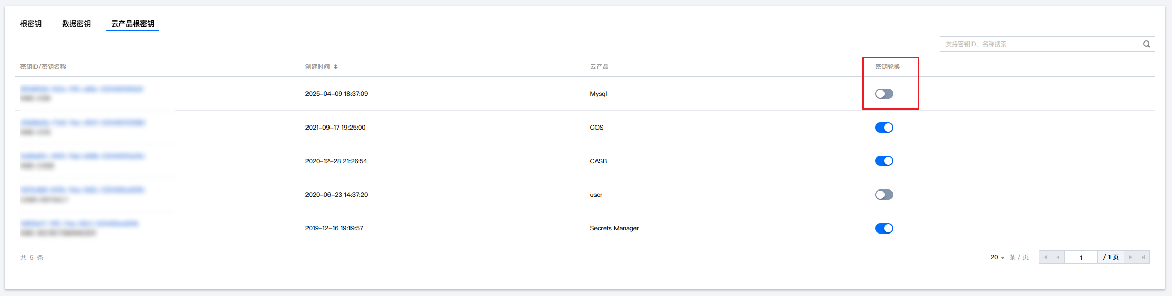 在云产品密钥管理页,选择您需要启用/禁用轮换的密钥,单击密钥轮换列的