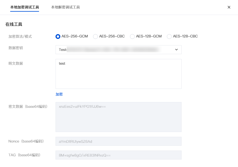 3. 在本地加解密调试工具中,选择符合业务场景的加密算法/模式、需要测试验证的数据密钥,输入明文数据后,单击加密。