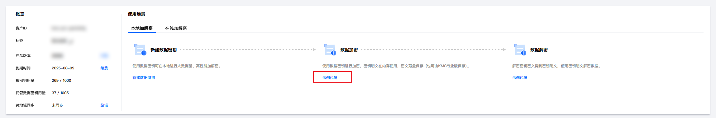 2. 在密钥管理页面的使用场景模块,单击本地加解密 > 示例代码。