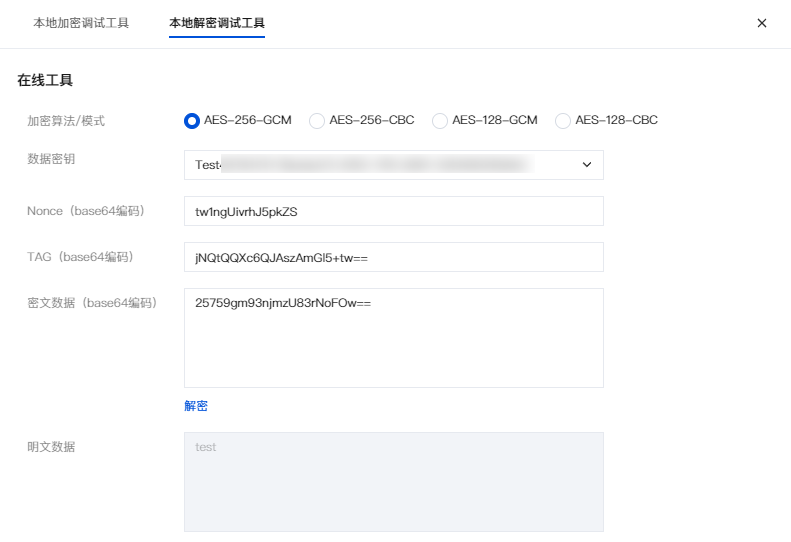 2. 单击解密,验证明文数据是否与测试的明文数据一致。