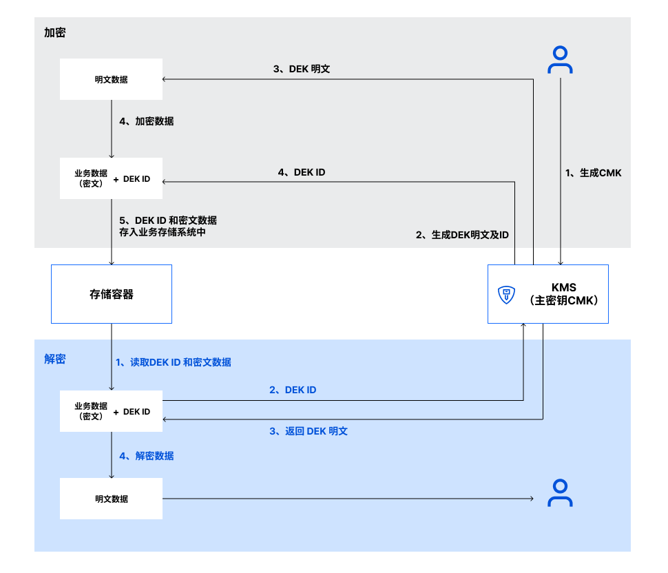 用户使用 KMS 数据密钥的整体过程可以概括为以下四步: