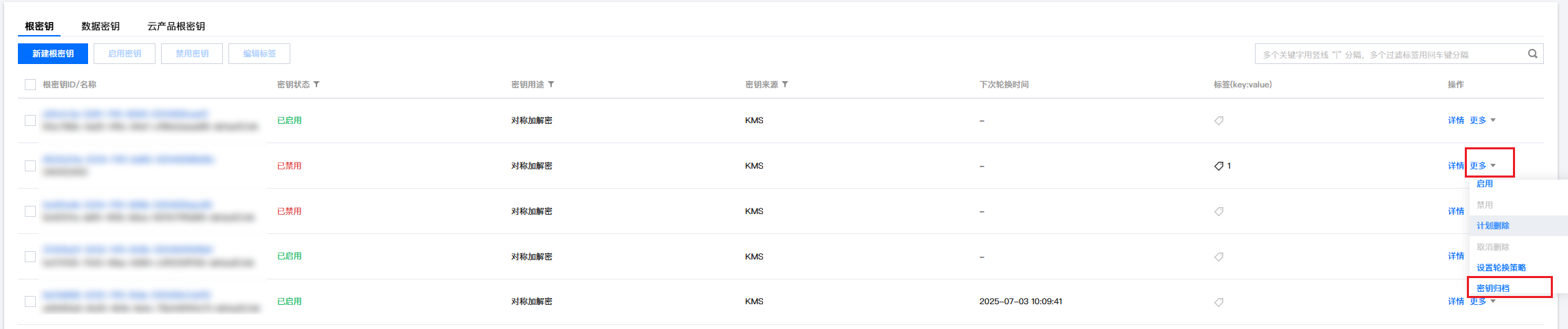 2. 在根密钥管理页,选择需要归档的密钥,单击操作栏中的更多 > 密钥归档、取消归档。可以对该密钥归档进行启用、取消归档操作。
