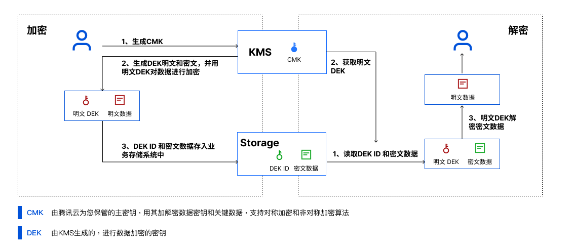 信封加密(Envelope Encryption)是一种应对海量数据的高性能加解密方案。信封加密主要使用数据密钥(DEK)在客户本地进行数据的加解密,DEK 被 根密钥(CMK)所保护,由 GenerateDataKey 接口生成,通过 GenerateDataKey 生成 DEK 时需要指定对应 CMK 的 KeyId。
