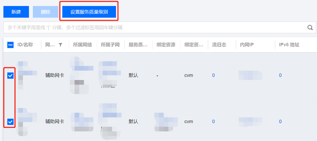 5. 如有多个弹性网卡需要设置为相同的服务质量级别,可勾选多个网卡,并单击上方的设置服务质量级别。