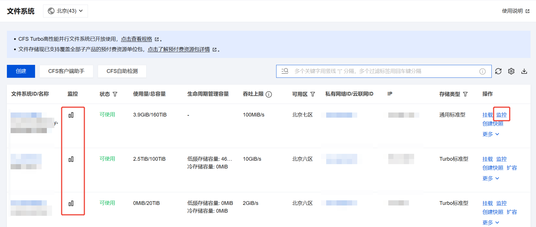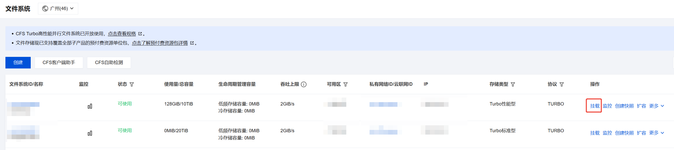1. 登录 文件存储控制台 > 文件系统,选择文件系统,在操作栏单击挂载。