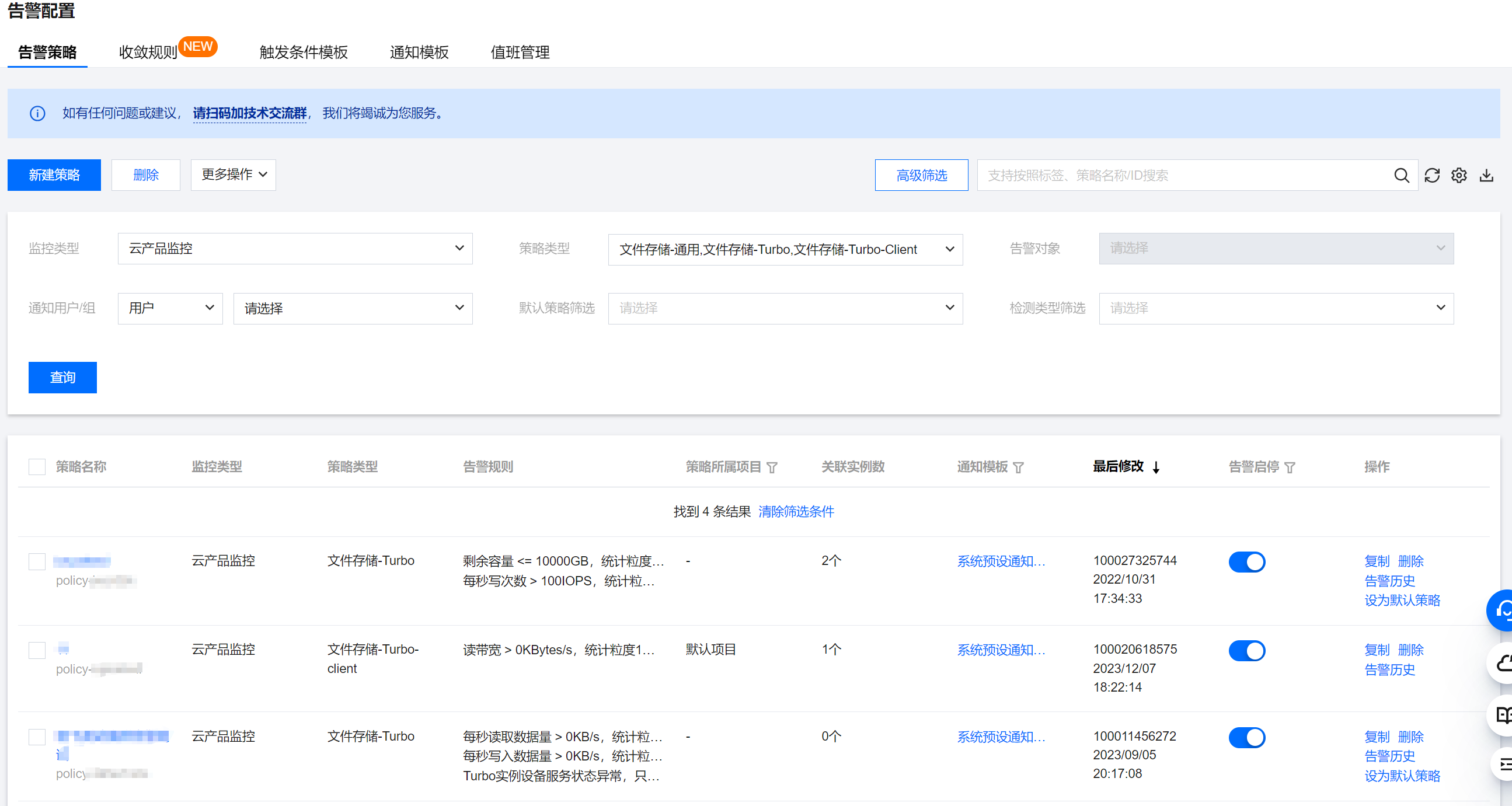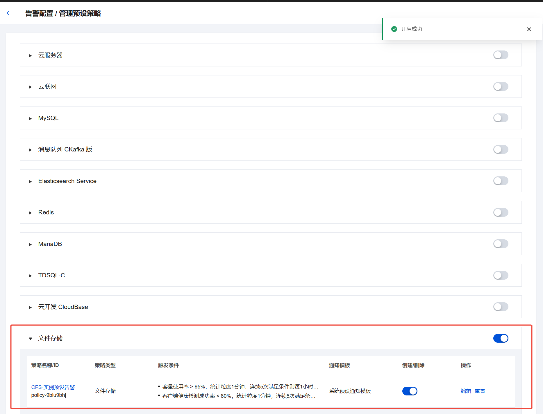 2. 跳转到 预设告警配置控制台,开启文件存储预设告警,并确认应用到全部文件存储实例。