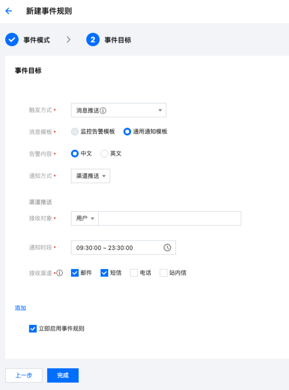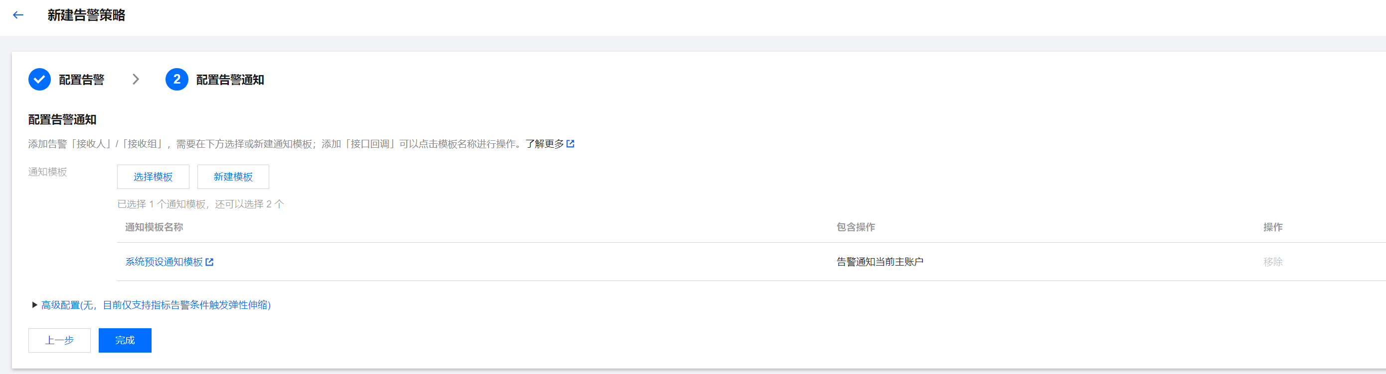 3. 单击下一步:配置告警通知,选择告警模板,单击完成。