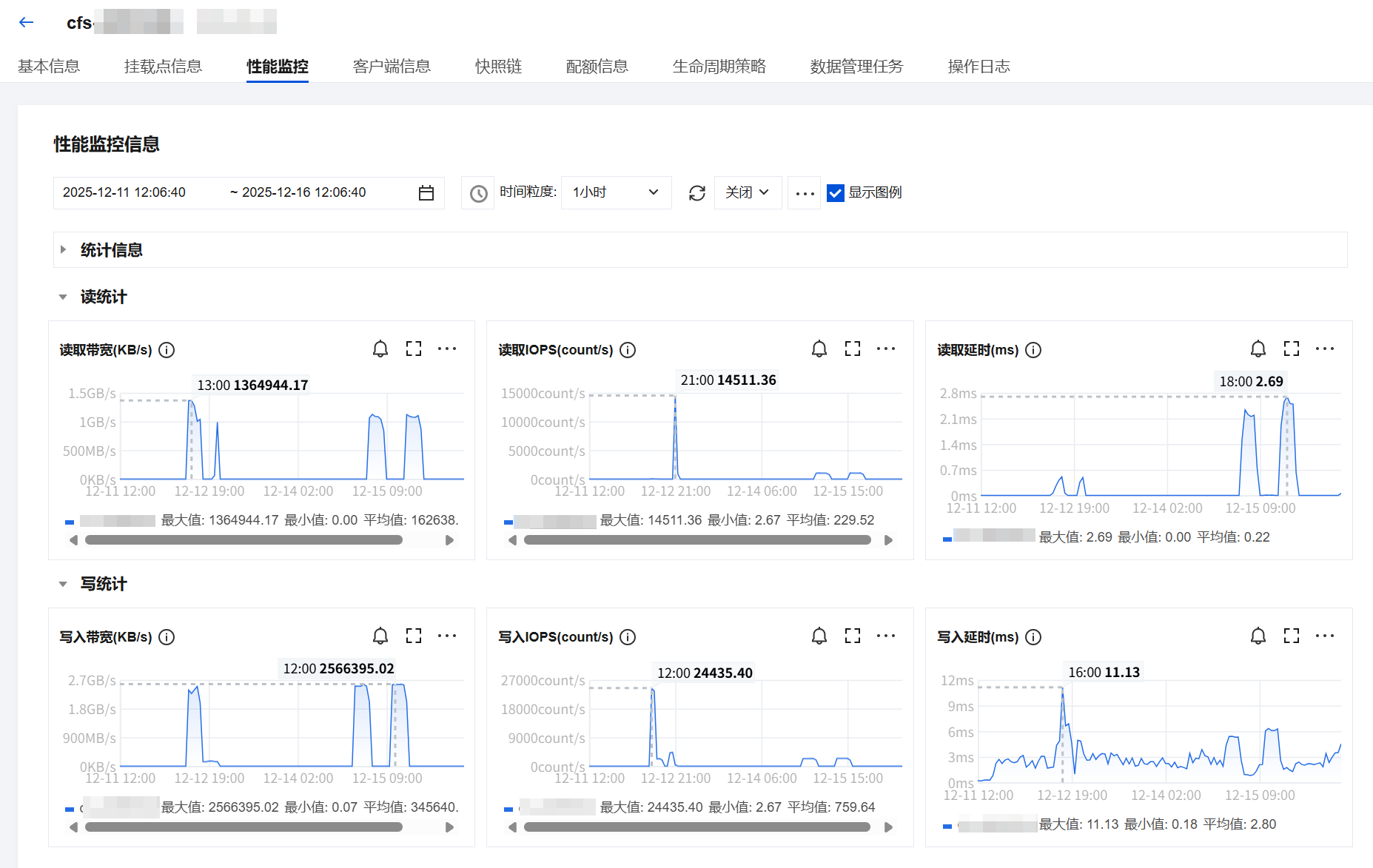 监控视图中的时间粒度会根据所选时间跨度自适应变化,较细的粒度(如分钟级)通常保留时间较短(如15天),而较粗的粒度(如天级)保留时间较长(如186天),以平衡存储成本和数据可用性。文件存储监控的展示策略如下: