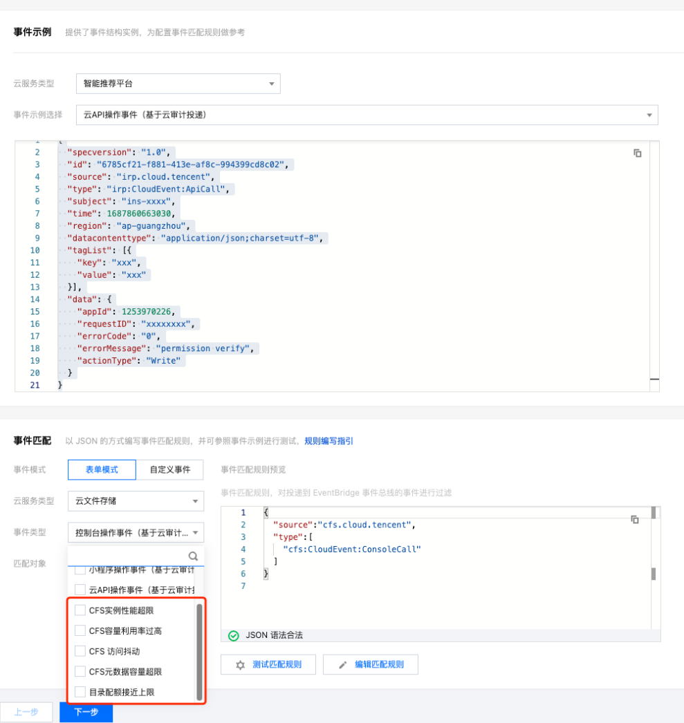 3. 云服务类型选择云文件存储,根据实际需要配置相关的告警事件,并单击下一步。