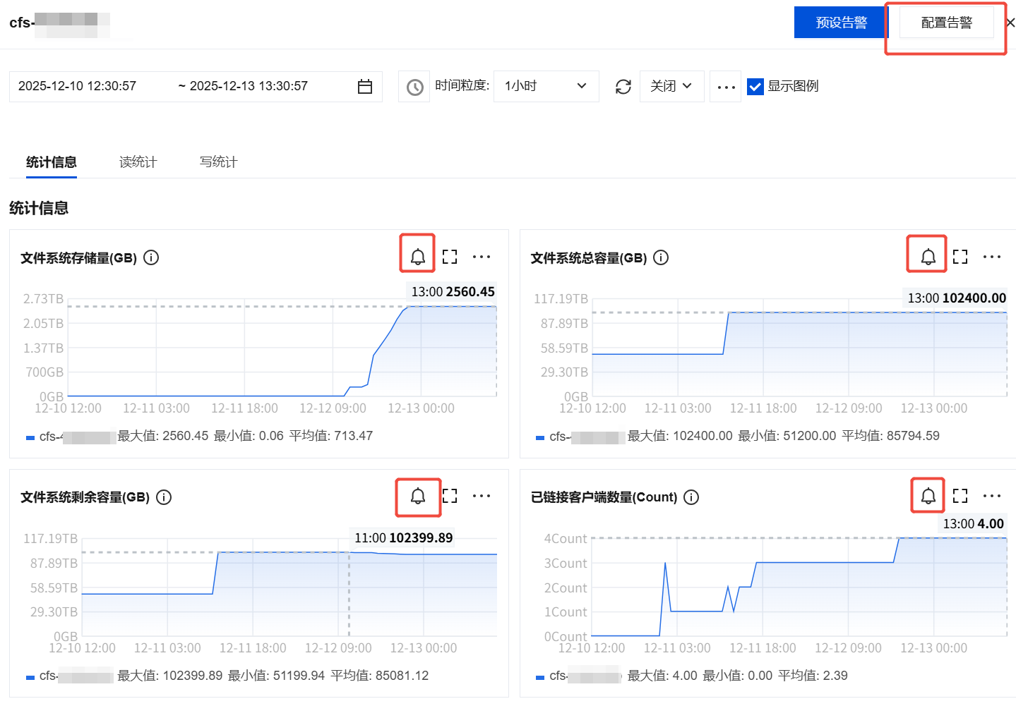 1. 登录 文件存储控制台 > 文件系统,单击监控栏图标或单击监控,然后单击监控视图右上角的预设告警。