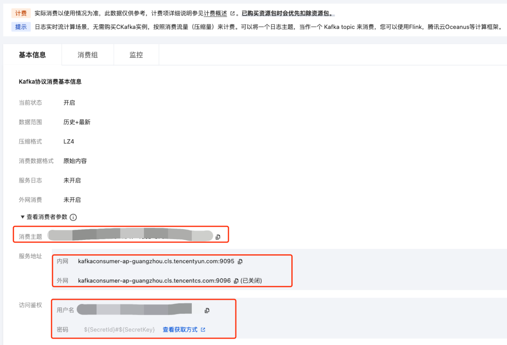 Kafka 密码 | 填写腾讯云账号的 AK/SK,使用#连接。并确保此 AK/SK 有基于 Kafka 协议消费的权限。 |