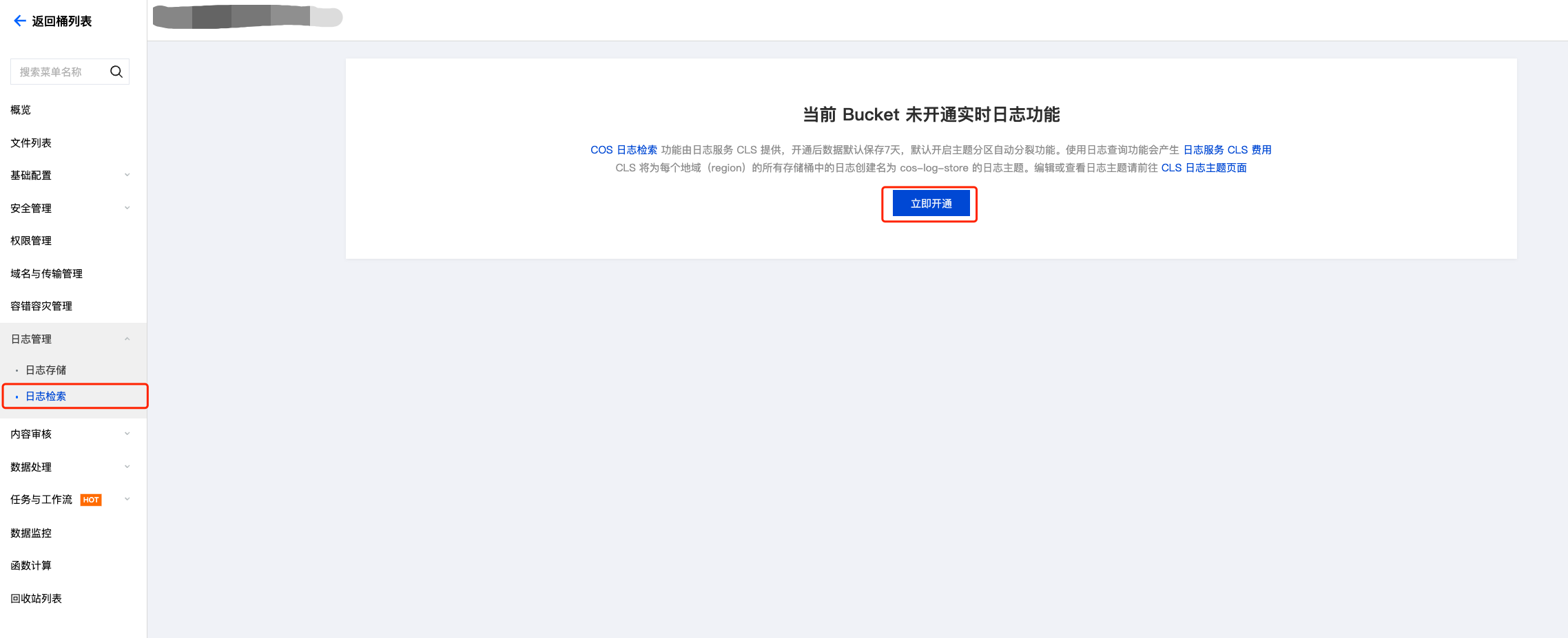 1. 开启此功能前请确保已开启对象存储日志检索能力,进入对象存储的实例,在日志管理 > 日志检索中,单击立即开通。
