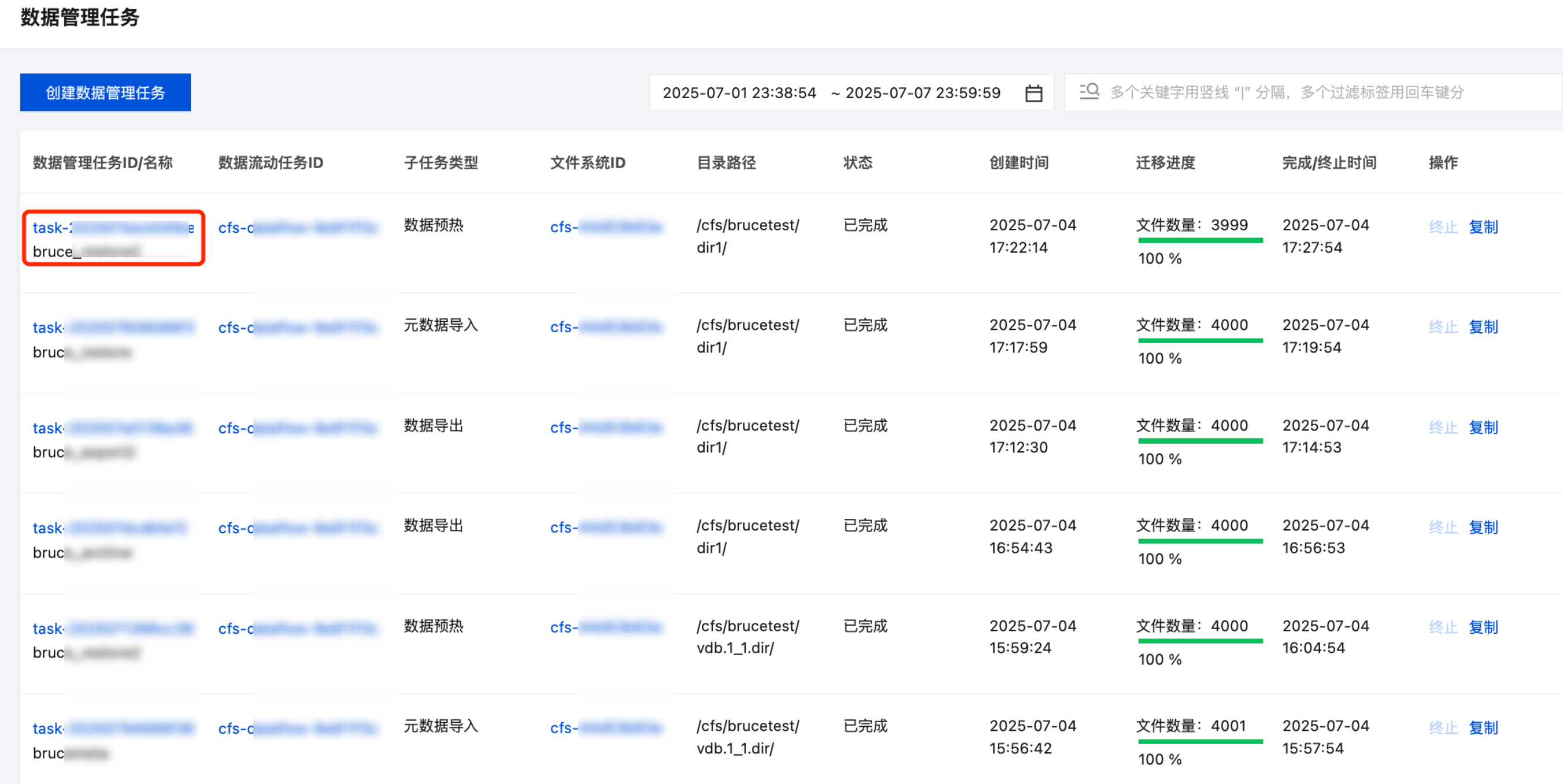 子任务类型 | 元数据导入:仅导入指定路径的元数据,不实际导入数据,如访问到此数据后端会触发异步拉取。 数据预热:仅对元数据已经在 cfs turbo 中的部分生效,触发预热任务后,会将数据加载到文件系统内。 说明: 对于元数据不在文件系统内的,无法触发预热的任务。 数据释放:仅对元数据已经在 cfs turbo 中的部分生效,能主动释放在文件系统的数据,完成容量的清理。 说明: 对于没有和对象存储建立过映射关系的文件,释放任务会跳过对此类文件操作,不会造成数据丢失。 和对象存储建立完数据流动映射后,若文件系统内数据未做修改,请确保对象存储中的数据始终存在,避免数据释放产生的损失。 对于 Turbo 文件系统中修改后的数据,需导出后才能触发释放。 数据导出:仅对从 Turbo 文件系统写入的数据生效,通过导出任务,支持将数据反向导出至对象存储。 说明: 导出后元数据和数据均保留在文件系统内,如果需要清理,可操作数据释放任务。 如果对象存储与文件存储中文件不一致,会直接覆盖对象存储数据,建议您启动任务前,开启对象存储的版本管理。 |