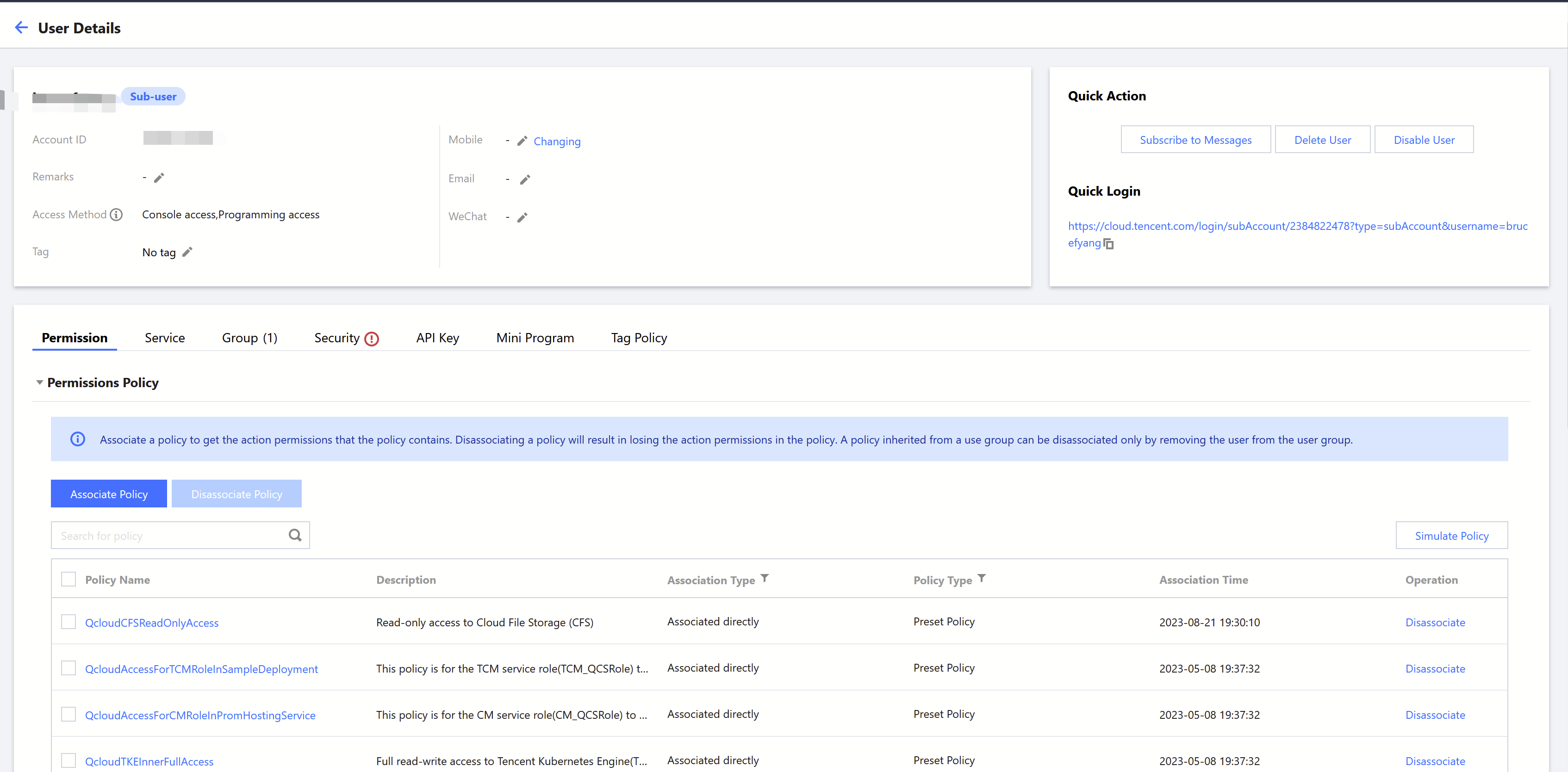 2. If you are using a sub-account, please contact the root account and refer to Sub-user Permission Settings to associate your sub-account with the QcloudCFSReadOnlyAccess policy. Successful association is as shown in the figure below: