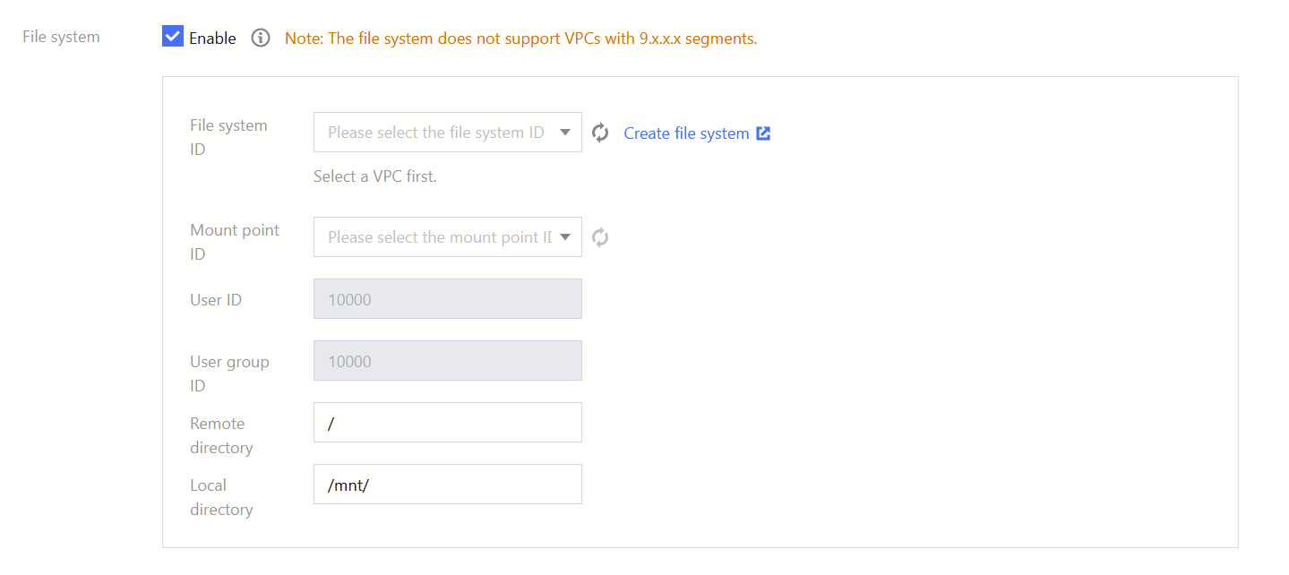 Remote Directory: This is the remote directory of the CFS file system that the cloud function needs to access. It consists of two parts: the file system and the remote directory.