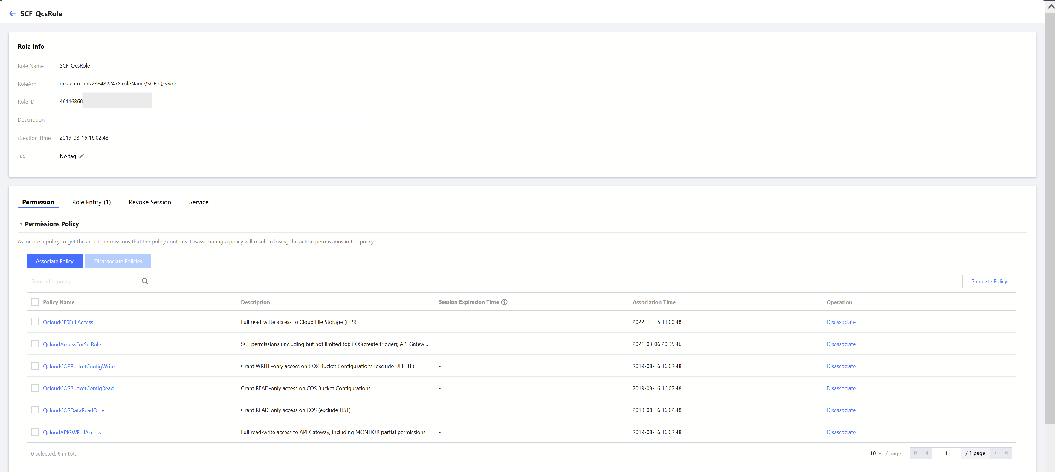 1. Please refer to Modify Role to associate the SCF_QcsRole role with the QcloudCFSReadOnlyAccess policy. Successful association is as shown in the figure below: