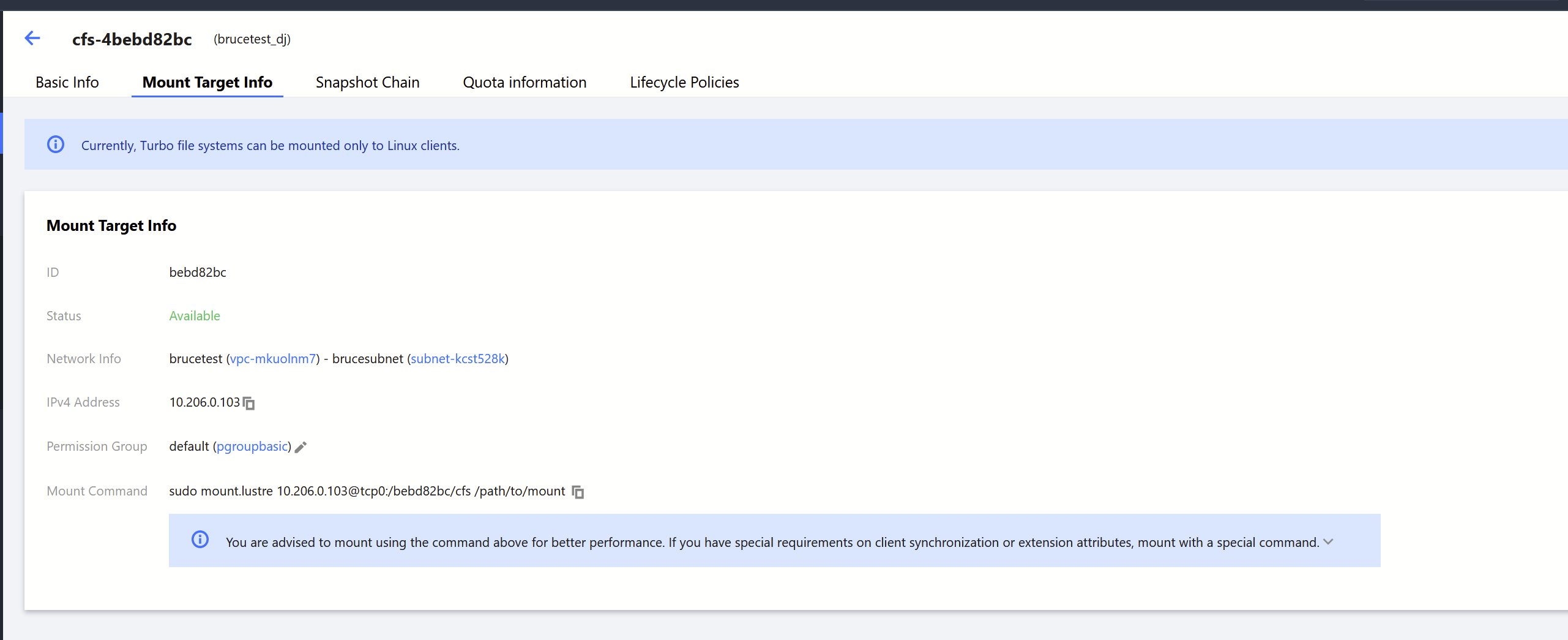 7. Click on the ID/name of the Turbo file system you wish to operate, and select the Mount Target Information tab.