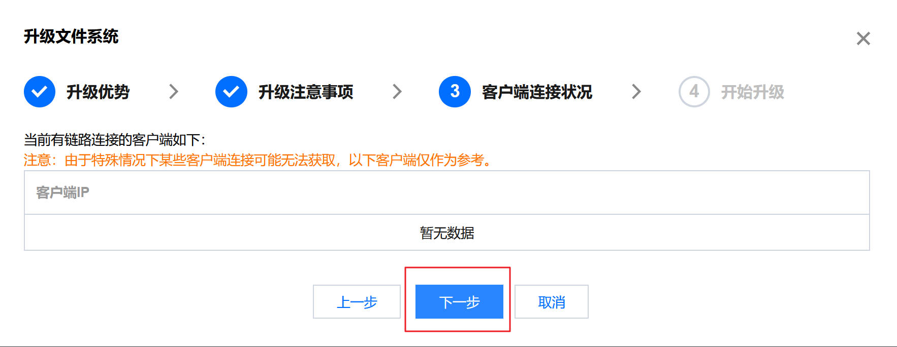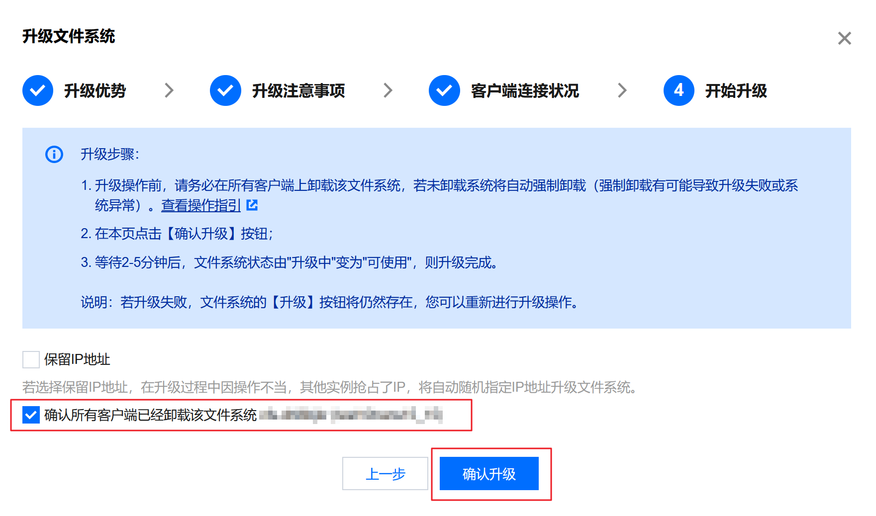 7. 勾选确认所有客户端已经卸载该文件系统,单击确认升级。