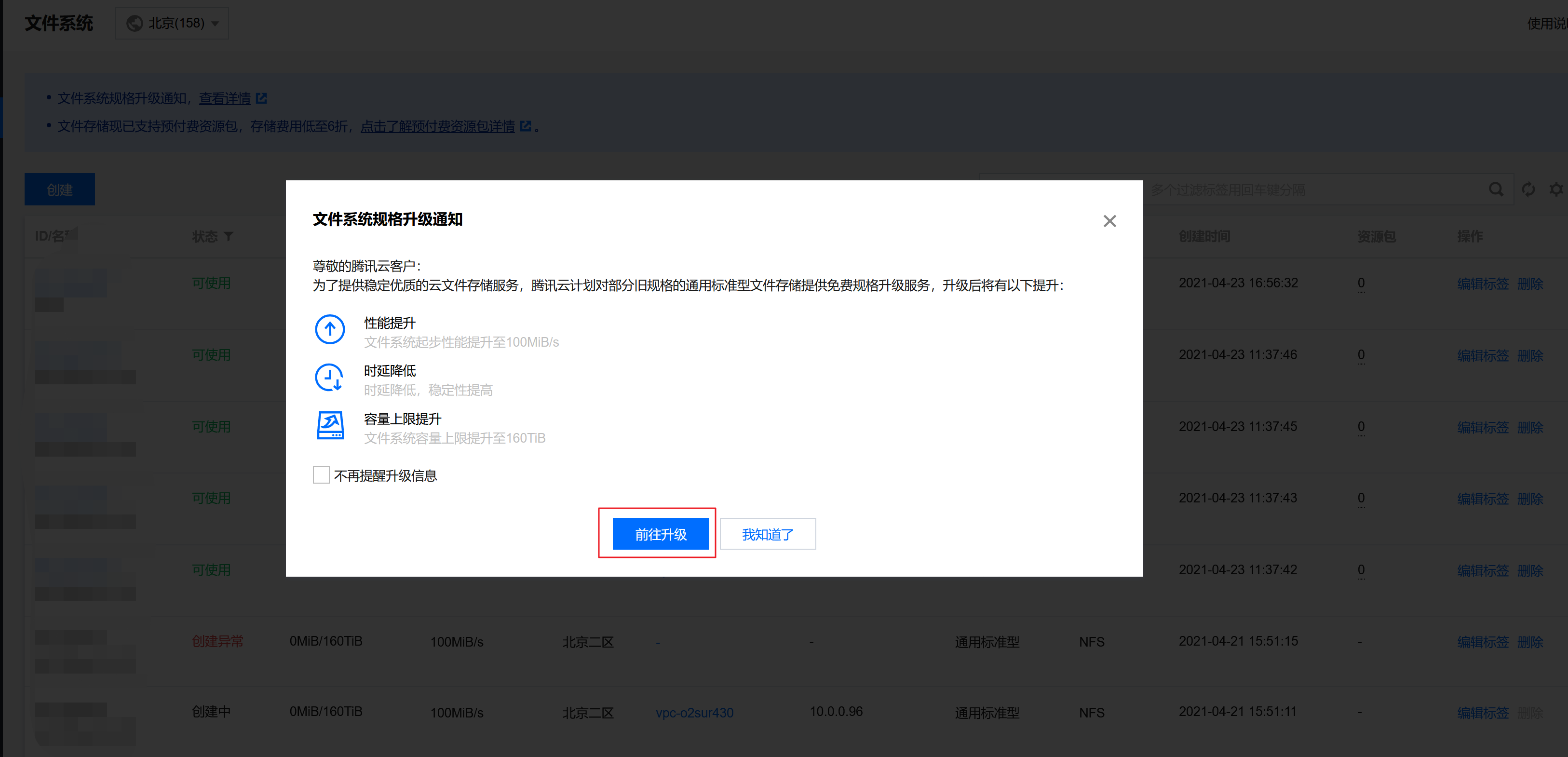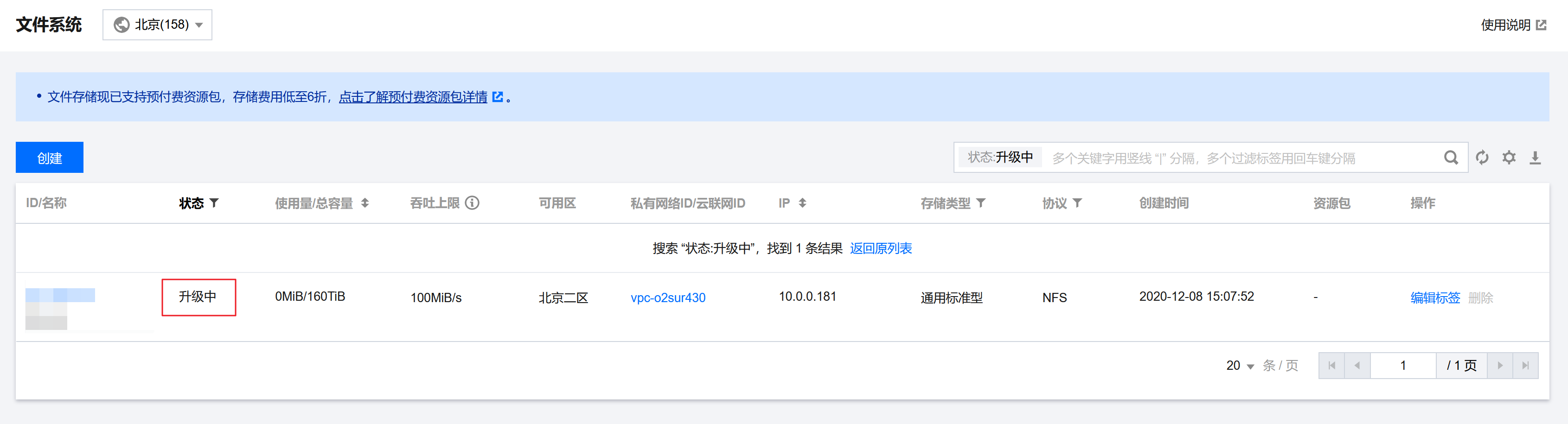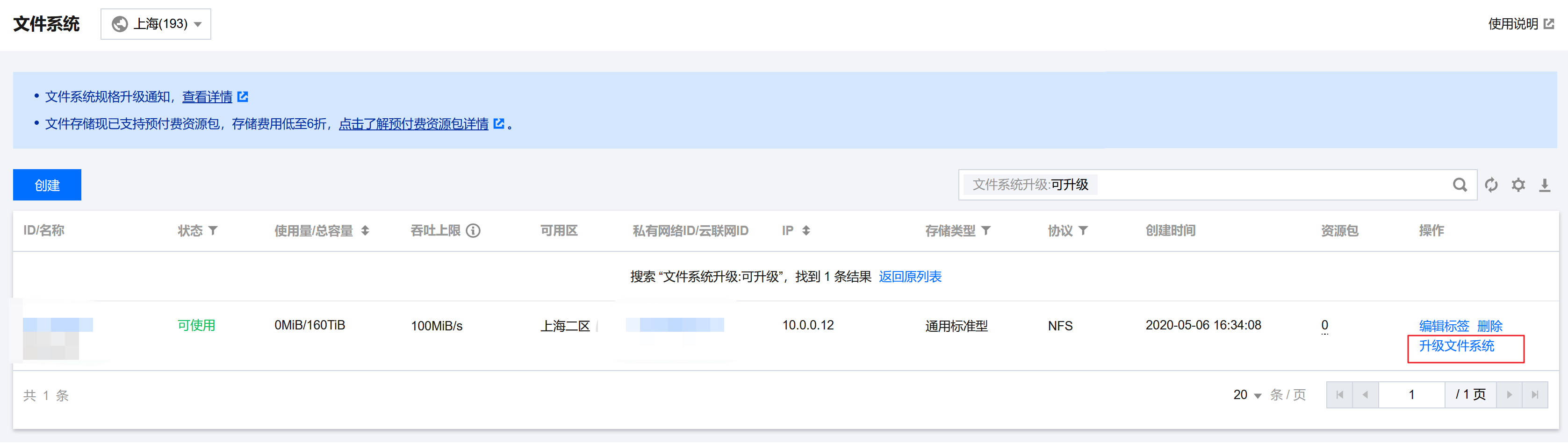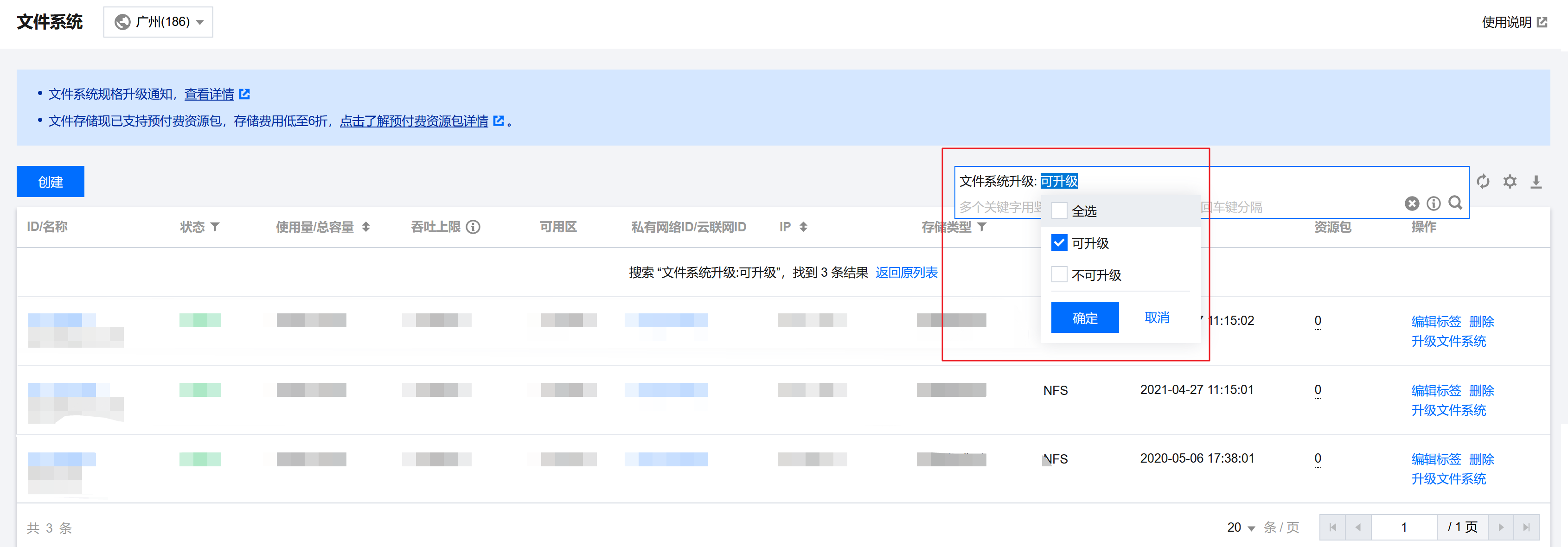 2. 选择文件系统升级,勾选可升级,单击确定,即可查看到当前地域下可升级的文件系统。