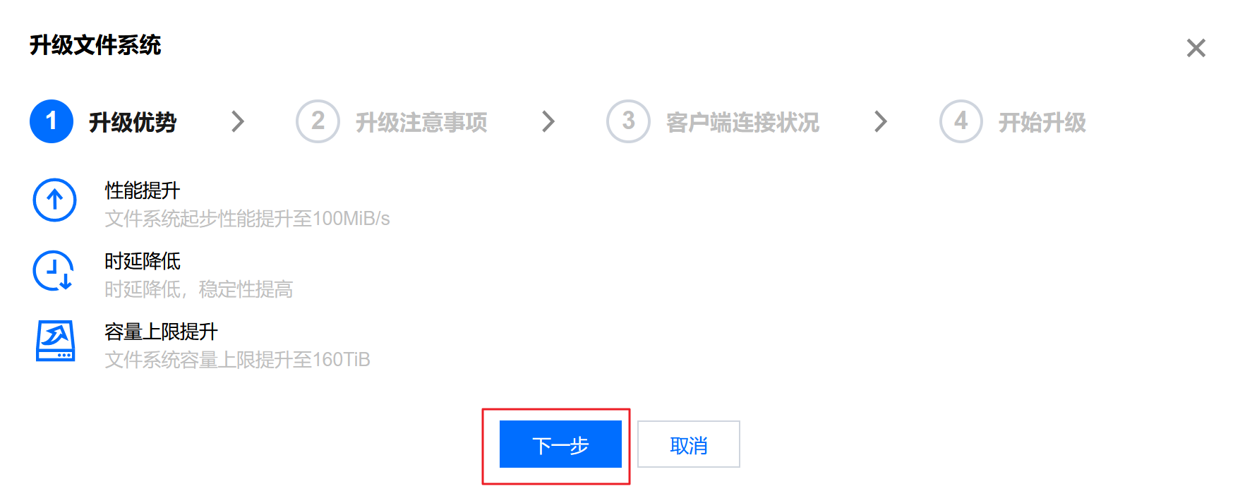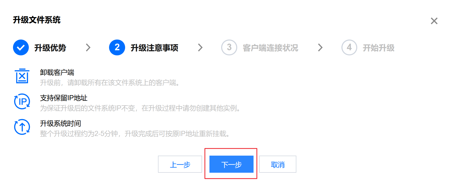 后台升级时间为 2-5分钟,操作升级前需要客户端卸载文件系统。升级后需重新挂载文件系统,建议至少预留半小时左右时间。