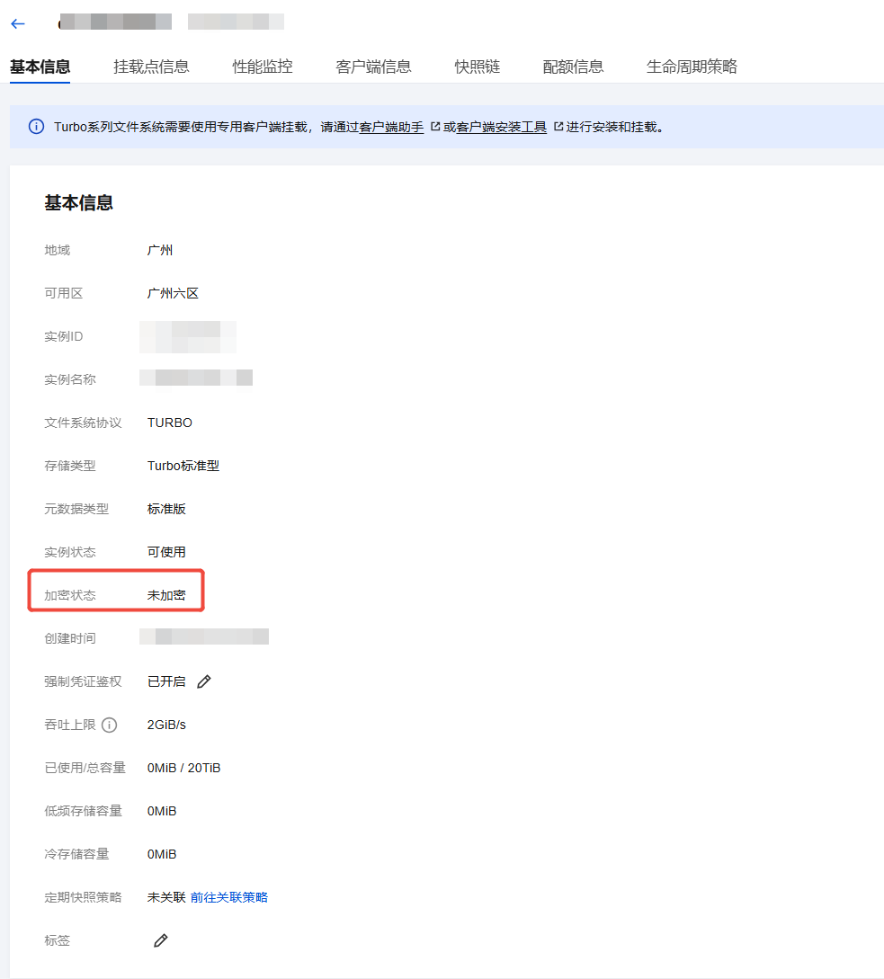 2. 加密查看。您可在文件系统详情页面中,查看文件系统是否加密。