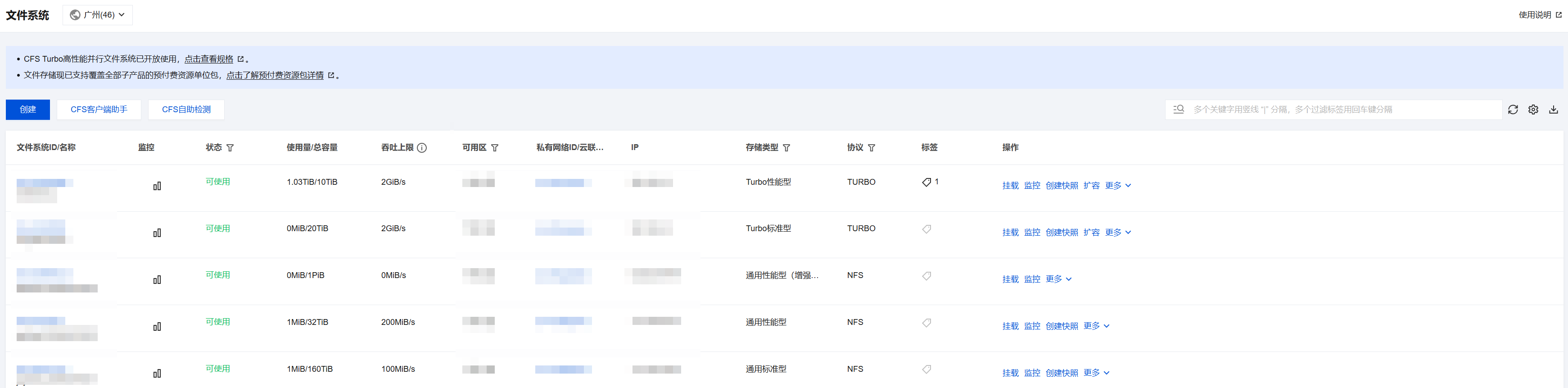 云文件存储限制 | 仅 Turbo 系列文件存储支持加密。 仅支持在创建时进行加密,文件系统创建完成后,无法进行加密处理。 已加密的 Turbo 文件存储无法转为不加密存储。 |