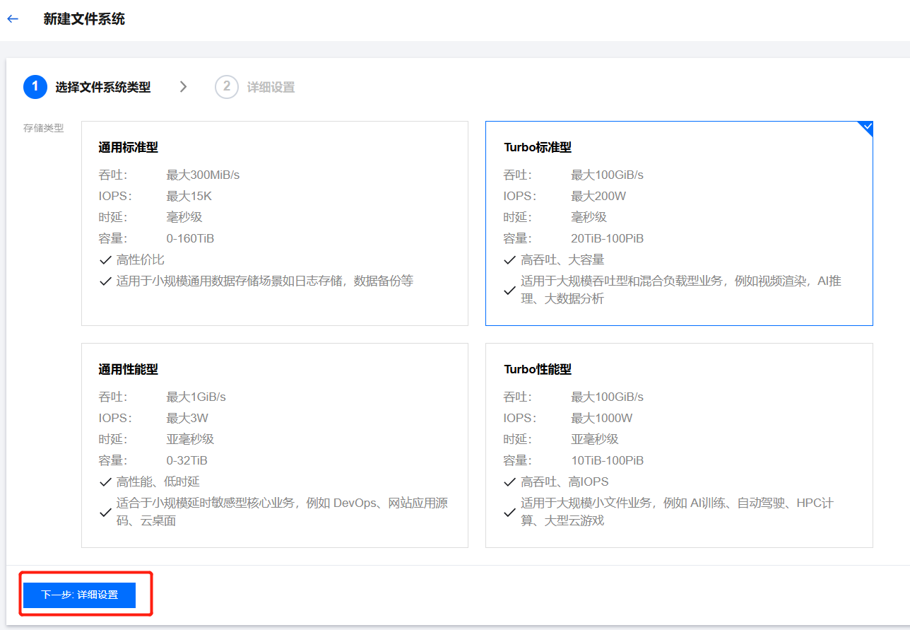 选择 Turbo 文件系统,单击下一步:详细设置。