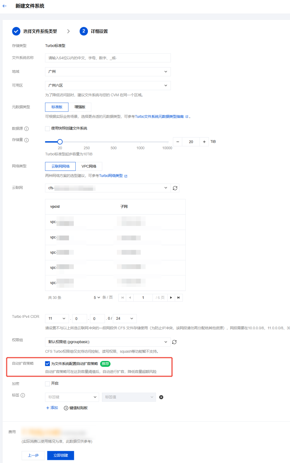 1. 在创建 Turbo 文件系统时,勾选配置自动扩容策略。
