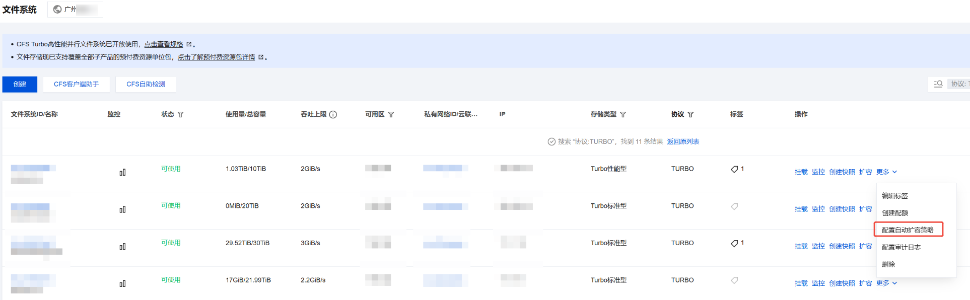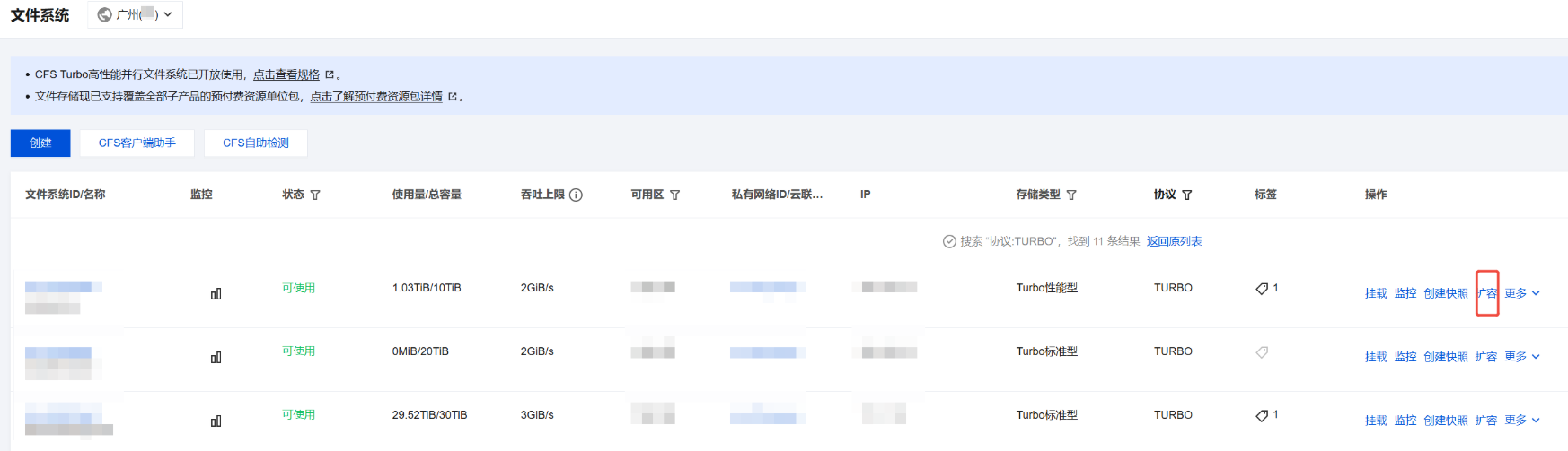 2. 选择需要扩容的 Turbo 文件系统,单击扩容,执行扩容操作。