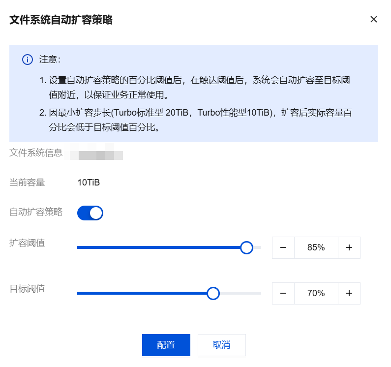 创建时默认的自动扩容策略为,开始阈值85%,扩容后阈值70%。即当容量利用率达85%时,启动自动扩容,将容量利用率降低至70%以下。