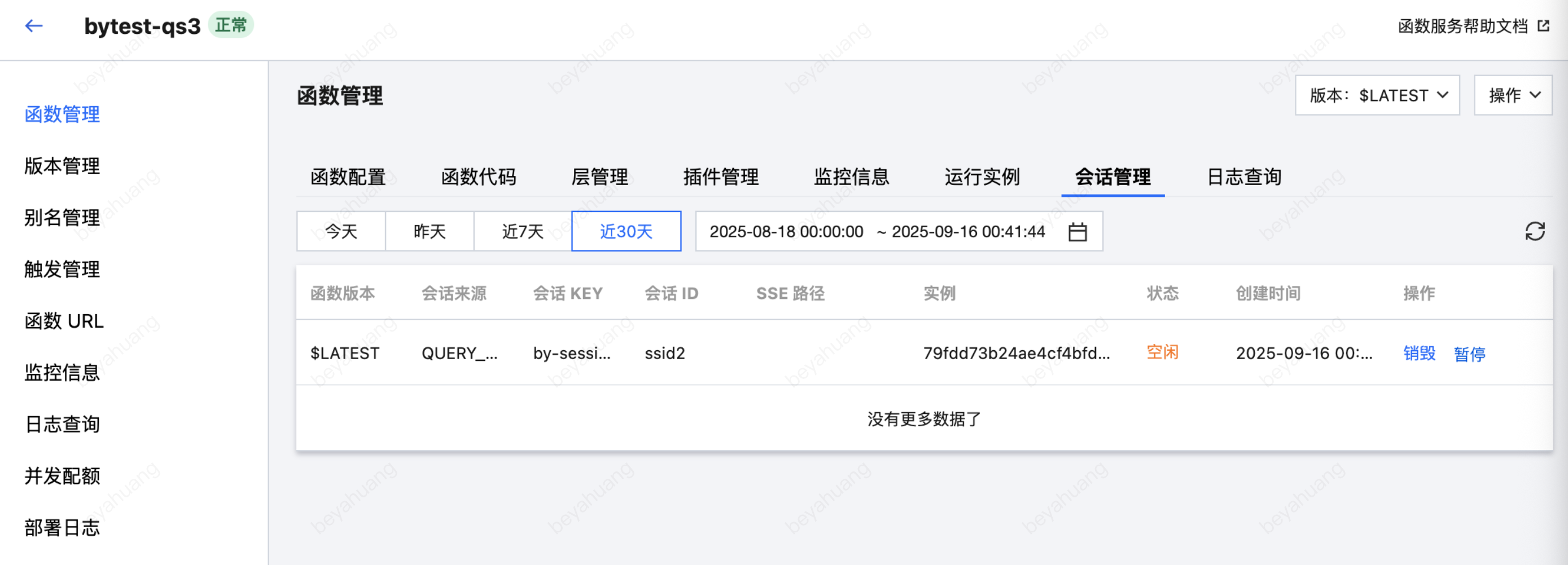 2. 选择您已经创建的函数,在函数管理页面,选择会话管理。若您配置函数的“单实例并发模式=基于会话”,您可以在会话管理查询到会话记录。