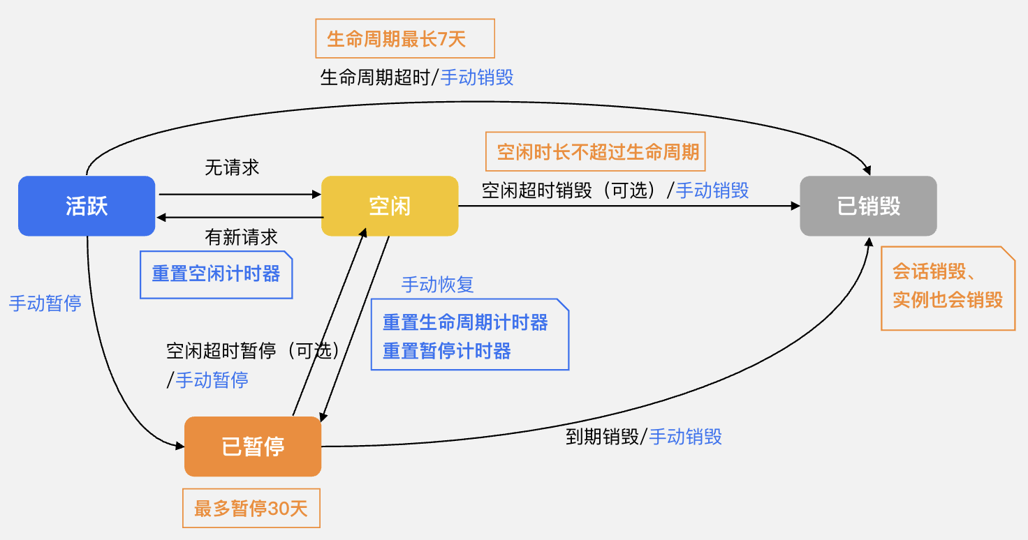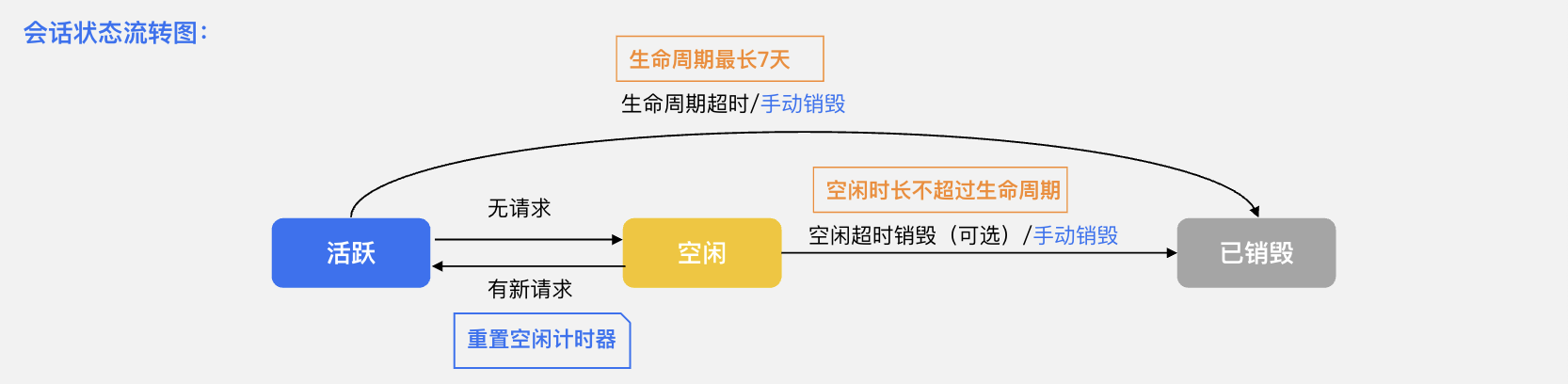 空闲会话:无请求时将启动空闲计时,达到最大空闲时间后系统自动销毁。您也可通过控制台或调用 API 手动销毁空闲会话。