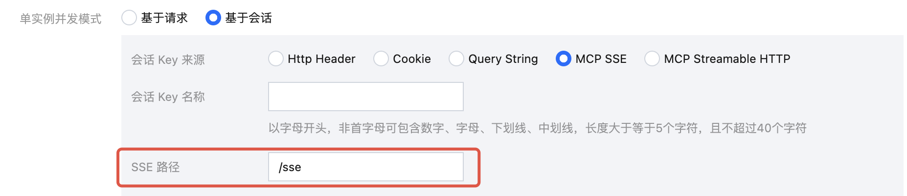 SSE 路径 | 如果会话 Key 来源选择 MCP SSE,需要填写发起 SSE 连接请求的路径。 ![]() | 默认 /sse ,支持修改 |