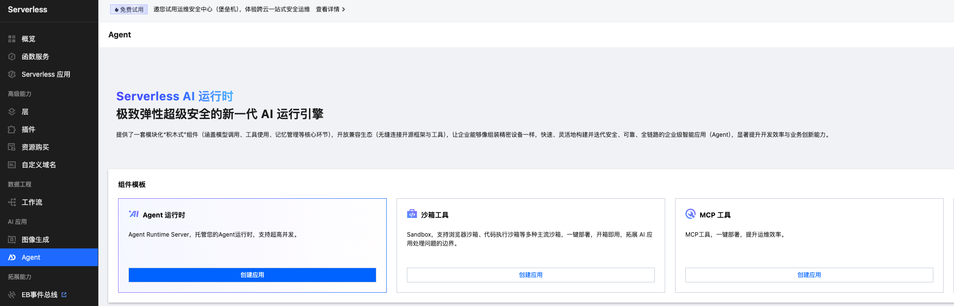 2. 在 Serverless AI 运行时页面上的 Agent 运行时区域,单击创建应用,进入应用创建流程。